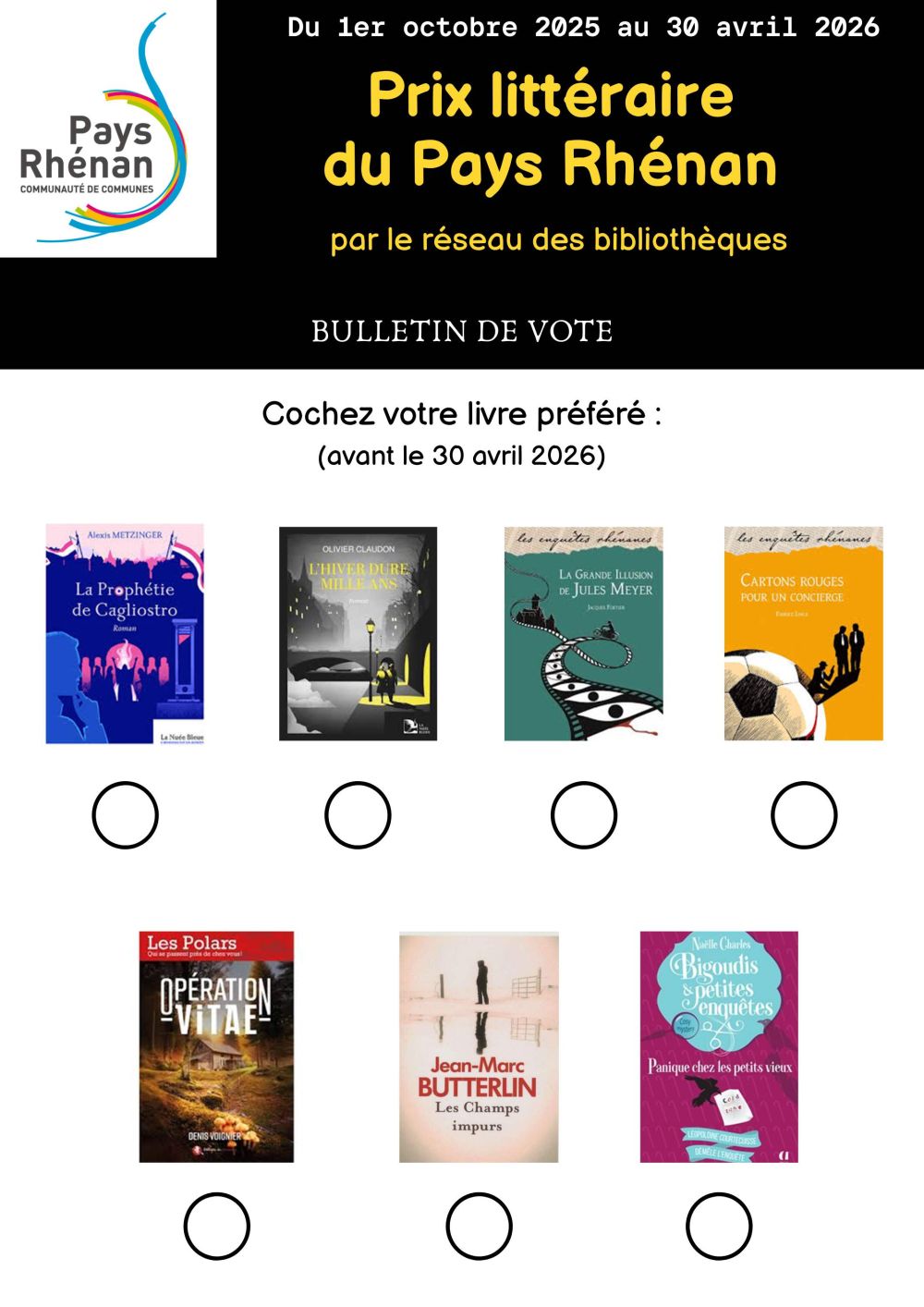 Des urnes de vote seront disponibles dans toutes les bibliothèques participantes, ainsi que dans les mairies et à la Maison du Pays Rhénan. Prenez part à cette belle aventure littéraire, empruntez, lisez et faites entendre votre voix !